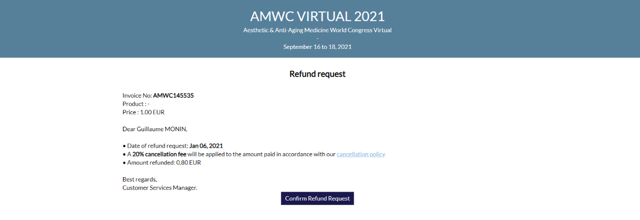 - up to 30 days before the first day of the relevant Event to receive a refund of 80% of the Event fees (the remaining 20% of those fees being retained as a processing fee); or